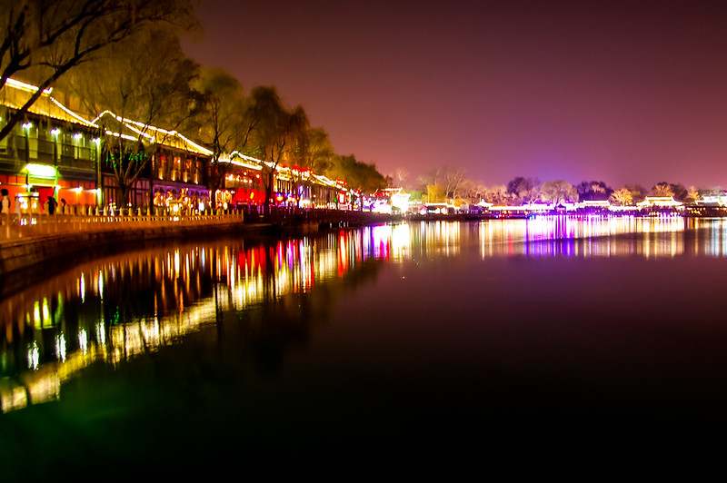 Houhai, one of the three lakes which make up the Shichahai scenic area in Beijing’s centre, is beautiful at any time of day, reflecting the soothing greens of willow trees and stark whites of marble bridges on its vast silver surface. But when darkness falls, the bar and restaurant-packed banks of Houhai Lake truly come into their own and, if it’s something special you’re after, this is the place to be.